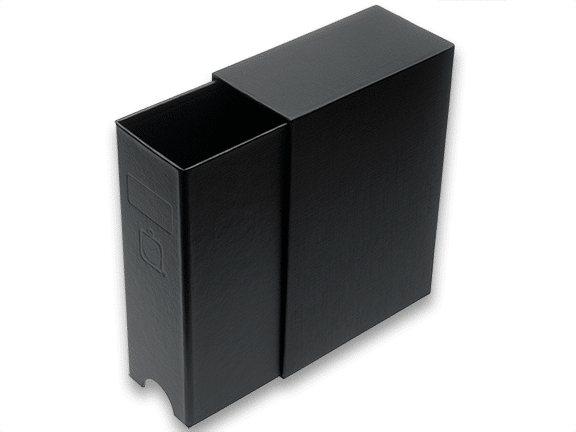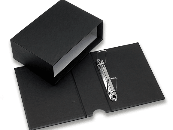 This piece goes beyond the anticipated packaging experience you might expect with custom binders and houses its two-ring binder in a custom slipcase. Combined, the two elements create one concentric piece; a decidedly secure and sturdy structure.