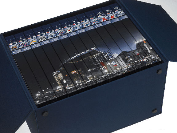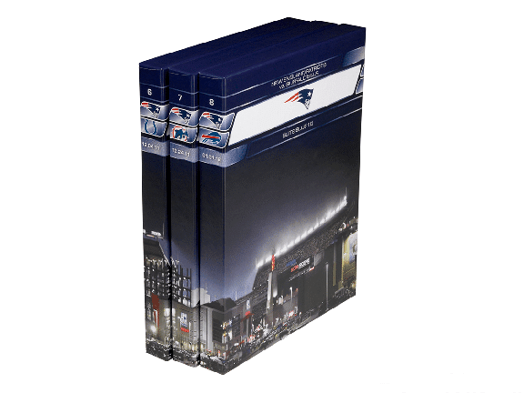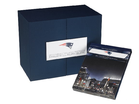 Derived from our Bespoke Luxury Packaging division Portfolio Box, this custom VIP set was wrapped in premium Cialux cover material in Midnight Blue and lined with Superfine paper from Mohawk Papers. When the hinged panels are opened, we’re met with a breathtaking panoramic view of the stadium sure to thrill any Pats fan. Inside were 4-color printed DVD style cases that together displayed Gillette Stadium seamlessly along the spine.