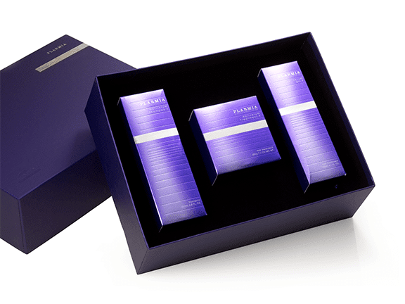 Milbon Salon’s line of Plarmia products was developed to rejuvenate and repair hair from the damaging effects of modern life. To accentuate the striking product packaging, we created a premium gift set packaging experience.