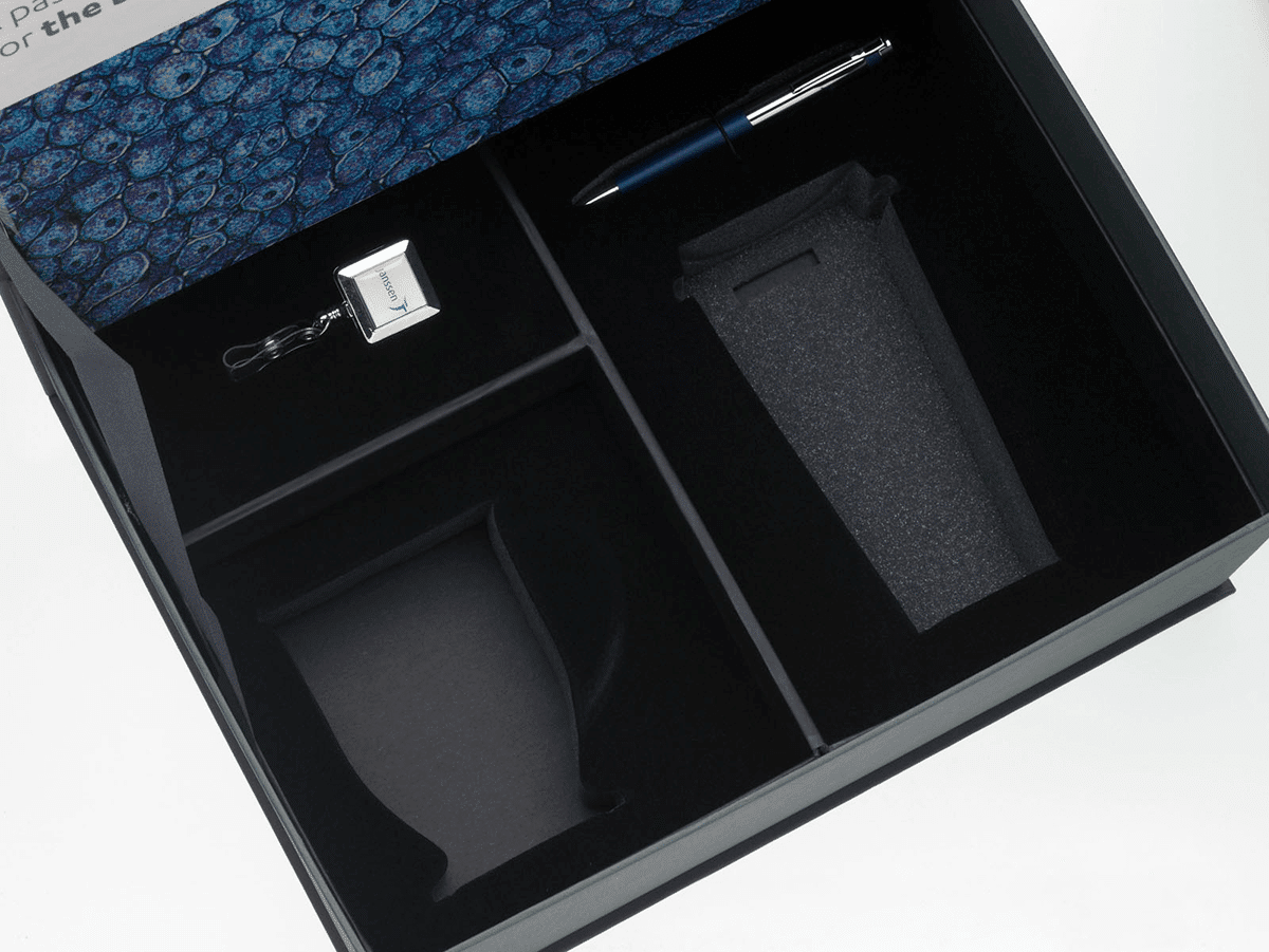 When Johnson & Johnson purchased Janssen Pharmaceutical Companies they worked with Two Paper Dolls Design House to create this elaborate new hire welcome box, as an onboarding gift for all those becoming part of the Johnson & Johnson family. This custom printed Tray in 3- Panel Folder Box, with a slipcase and custom inserts, was an impressive presentation that held print collateral pertaining to employee benefits and company changes, and swag such as a mug, tumbler, badge, pen, and other items within the custom chipboard and foam inserts.