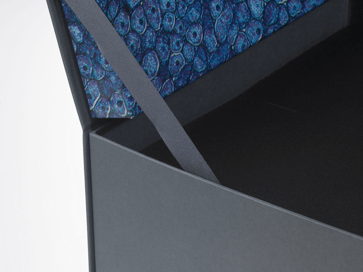Composed of a durable heavy black chipboard that was wrapped in a variety of cover materials including 4-color offset printed paper, Rainbow paper from Ecological Fibers, and Sierra Paper. The new hire welcome box is outfitted with premium packaging features such as interior trays lined with die-cut foam to cradle the contents, a ribbon stay to secure the lid to the tray, and a foil stamp and deboss decoration on the front panel. To maximize the available space of the box, a slipcase was fixed to the inside of the lid to hold a beautiful leather padfolio and additional collateral.